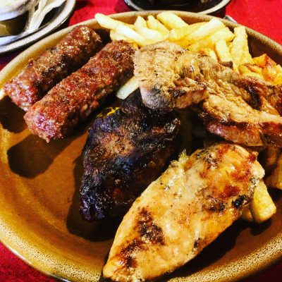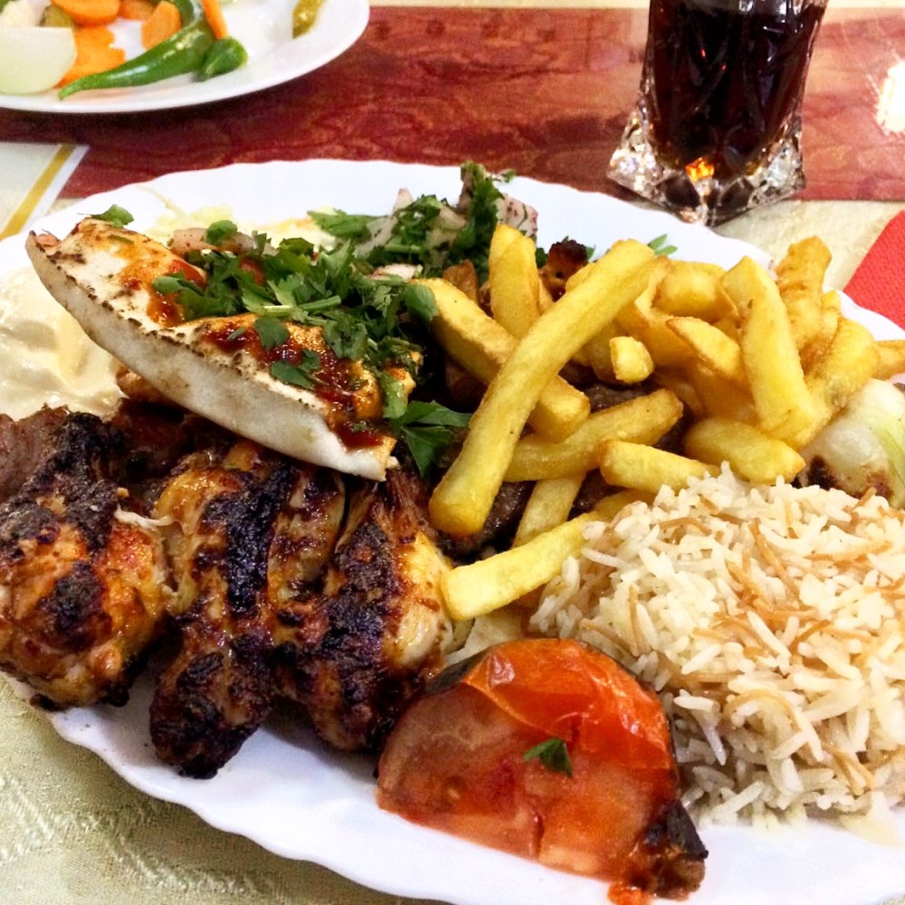 Nach Abpfiff vereinigten wir uns mit Ole wieder am Kassenhäuschen und konnten dem betrügenden Taxifahrer doch noch etwas Positives abgewinnen. Er hatte uns schließlich weit abseits vom Haupteingang rausgelassen und dort fiel uns vor zwei Stunden das Restaurant Damascus Palace durch auf die Straße ziehendes Holzkohle-Aroma positiv auf. Aufgrund der fortgeschrittenen Tageszeit war es ganz gut, bereits im Stadionumfeld zu dinieren. Für gerade mal 35 Lei (also 8 €) pro Portion gab es nun Mixed Grill mit Lammspieß, Lammhackspieß, Hähnchenbrustspieß, Hähnchenunterschenkeln, Grillgemüse, Brot, Salat, Pommes, Reis und Sauce. War alles sehr schmackhaft und dazu gab es gratis Mixed Pickles vorweg und ein süßes Dessert (Grieß mit Granatapfelsauce) hinterher.
