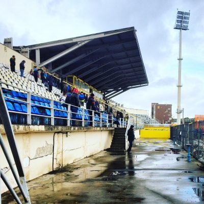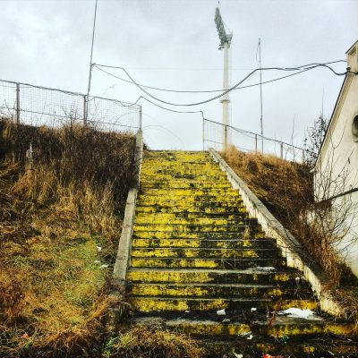 Das Stadion hellte unsere Mienen zum Glück wieder auf. Es handelte sich um eine herrliche Ostblockbude mit viel Rost, abblätterndem Putz und ausgeblichenen Sitzschalen. Hinter einem Tor ist eine Zuschauerkurve, die jedoch gesperrt war und hinter dem anderen Tor ist kein Ausbau für Stadionbesucher, aber dafür eine mehrstöckige Bauruine zu sehen. Die Haupttribüne ist, abgesehen von der VIP-Loge, auch relativ heruntergekommen. Auf den unüberdachten Sitzschalen der Gegengerade findet man wiederum die sangesfreudigen Fans, die sich hinter dem großen Banner Steagul Roşu Braşov versammelt hatten.