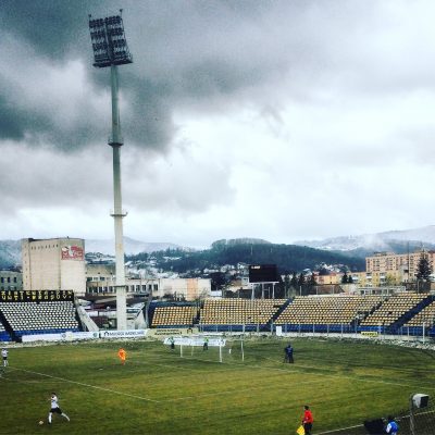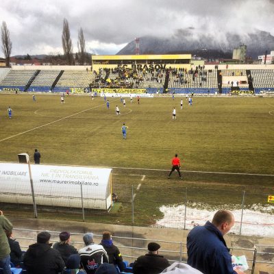 Mittlerweile hatte sich auch das Wetter aufgeklart und wir erspähten plötzlich die ganzen Karpatengipfel an der Stadtgrenze. Wobei natürlich besonders der 960 m hohe Tâmpa mit seinem hollywoodmäßige Brașov-Schriftzug ins Auge fällt. Nach dem Ende des Schneeregens orientierten wir uns außerdem so langsam in Richtung Stadion. Um kurz nach 12 Uhr durfte uns ein Taxifahrer für 10 Lei (rund 2,20 €) vom Hauptplatz zum drei Kilometer entfernten Stadionul Tineretului (Stadion der Jugend) fahren, wo die nächsten 10 Lei für den überdachten Sitzplatz gelöhnt werden mussten (ein unüberdachter Sitz hätte 5 Lei gekostet).