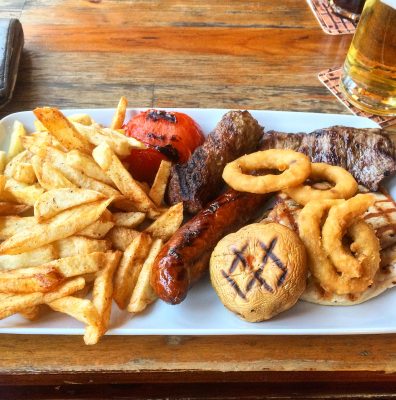 Unweit des Stadions war außerdem der Trafalgar Pub zu finden, den wir gestern eigentlich schon für Biere nach dem Spiel auserkoren hatten, hätte es im Stadionul Dinamo stattgefunden. Im Lokal stellte ich als erstes fest, dass Ciuc Pilsener definitiv nicht so mundete wie Ciuc Naturradler. Mit dem Radler hatten wir an den Vortagen gute geschmackliche Erfahrungen gemacht, aber das Pils hatte im Antrunk so ein bisschen Essiggeschmack. Tadellos waren dagegen die Fleischplatten, die für 45 Lei (10 €) gereicht wurden. Handgeschnitzte Fritten, frittierte Zwiebelringe, eine gegrillte Tomate und ein gegrillter Champignon ergänzten ein Hackfleischröllchen, eine Krainer Wurst, ein Schweinerückensteak, ein Rinderfiletsteak und ein Putenbruststeak vortrefflich.