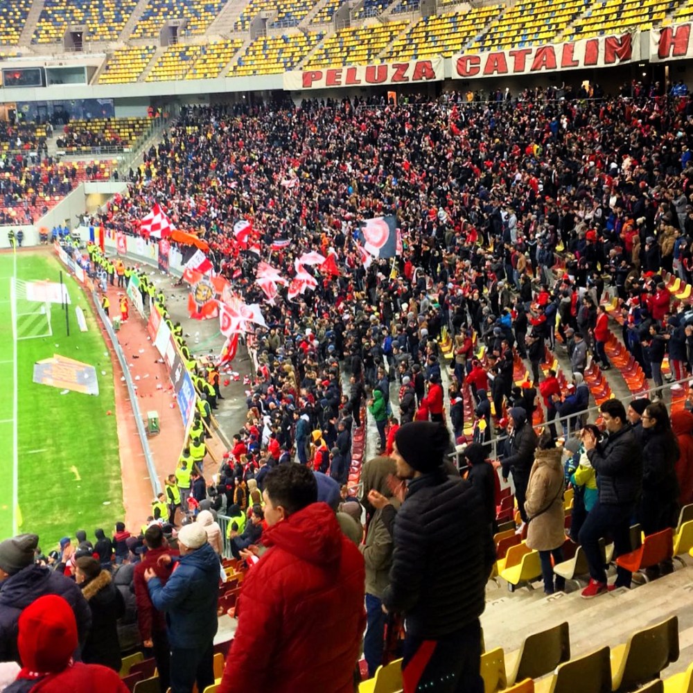 Bereits in der 5.Minute durfte die überwältigende Mehrheit im Stadion jubeln. Der Slowake Adam Nemec, vielen sicher noch von seinen Gastspielen in Aue, Lautern und bei Union Berlin bekannt, erzielte das 1:0 für den rumänischen Vizerekordmeister (Dinamo hat bisher 18 Meistertitel errungen, Steaua București hingegen 26). Ein paar Kanonenschläge würdigten den Treffer von Fanseite. Der Rekordvizemeister (Dinamo wurde zwanzigmal Vizemeister, Steaua lediglich vierzehnmal) nutzte den Schwung der frühen Führung und den Rückenwind der anpeitschenden Fankurve. Erinnerte etwas an italienische Kurven in der guten alten Zeit. Schon in der 14.Minute machte Nemec die Fans nochmal glücklich und baute den Vorsprung auf 2:0 aus. Es knallte wieder vor der Kurve und die anfangs ebenfalls gut aufgelegten Ultras im Gästesektor waren jetzt vorerst bedient.