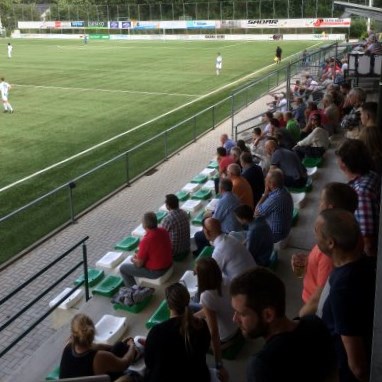 Der Eintritt kostete 5 € und knapp 200 Interessierte hatten zu Spielbeginn die Tore passiert. Darunter auch circa zwölf Spanischstämmige. Denn UCE de Liège ist ein Club spanischer Migranten (mit rot-gelben Trikots und einem schwarzen Stier als Logo). Bei den Heimfans war wiederum relativ viel Französisch (neben Deutsch) als Umgangssprache zu hören. Das dürfte an einst zugezogenen wallonischen Bergarbeiterfamilien und der besonderen Geschichte der Gemeinde Kelmis liegen.