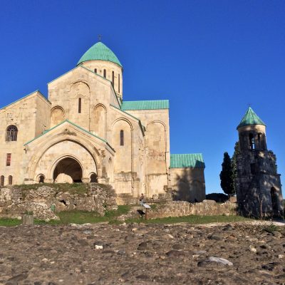 Am zentralen Platz in Kutaisi war Endstation und von dort waren es lediglich 500 Meter zu unserem Hotel Imperator Palace an der Kettenbrücke. Vom Balkon hatten wir sogleich einen schönen Ausblick und beschlossen die dabei erspähte Bagratis tadzari (Bagrati-Kathedrale) zeitnah aufzusuchen. Dazu musste ein Hügel namens Ukimerioni erklommen werden, ehe uns die bereits vor über 1.000 Jahren unter König Bagrat III. erbaute Kathedrale mit offenen Toren und Türen empfing (offizieller Name: Kirche der Entschlafung der hochheiligen Gottesgebährerin). Drinnen hält sie diverse Reliquien von Heiligen parat. Außerdem gibt es einen großen Thron. Wahrscheinlich für den georgischen Patriarchen, wenn er mal reinschaut. Oder soll es der Thron von Kirchenstifter Bagrat III. sein? Ich gestehe, diese Rechercheleistung habe ich nicht erbracht.