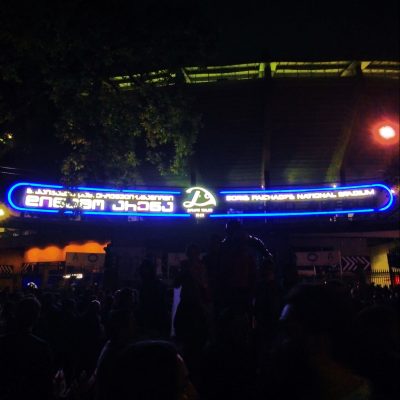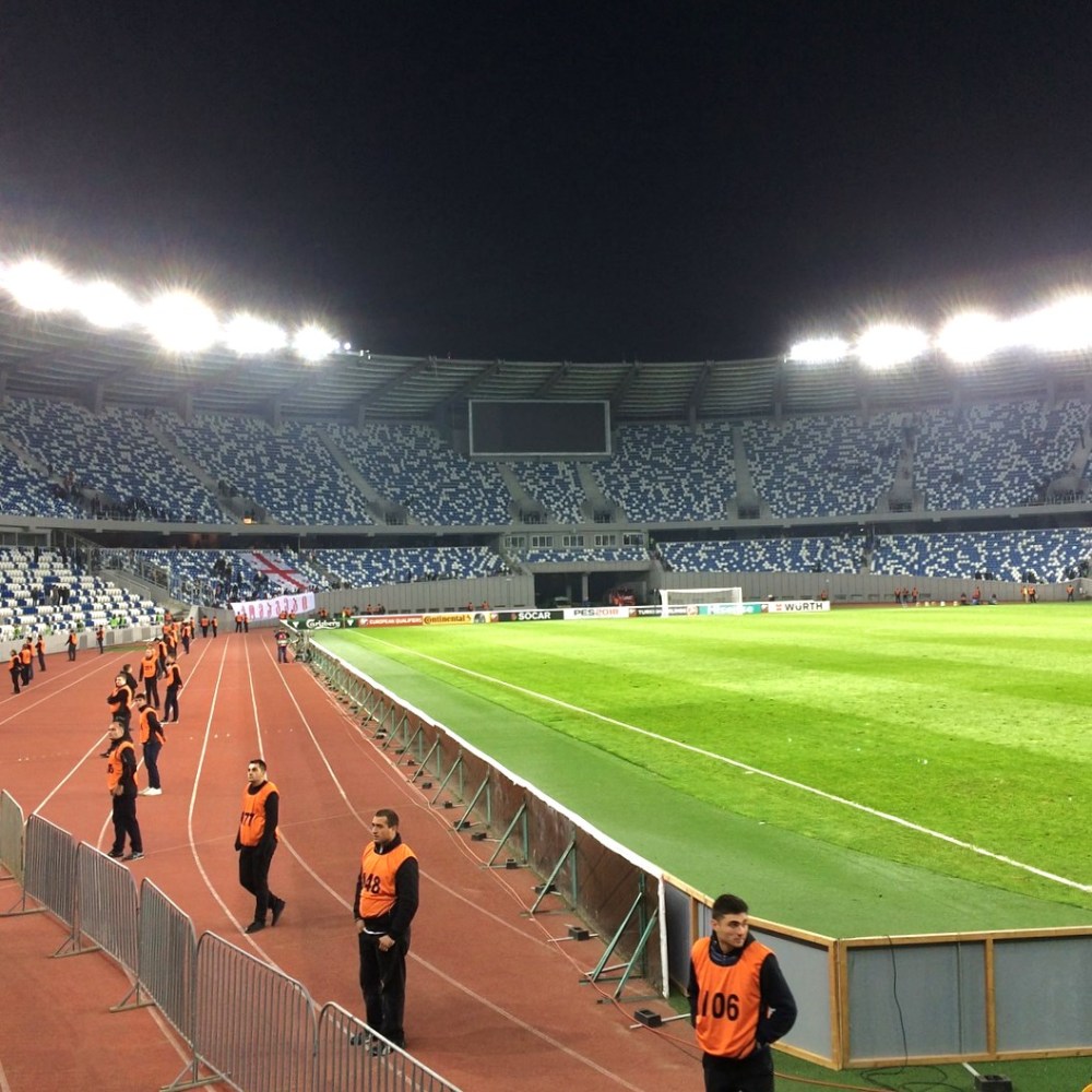 Man hätte jetzt noch ewig den Geschichten von der EM 2016 lauschen können („Beim Halbfinale hätten wir alle schon wieder Arbeiten müssen.“ „Und, wieviele sind nach Hause geflogen?“ „Natürlich keiner!“), doch heute stand ja auch noch ein bedeutendes Spiel an, dessen Ausgang wichtig für die Frage ist, ob das Fußballwunder der walisischen Nationalmannschaft kommenden Sommer ein neues Kapitel bekommt. Also gegen 19:15 Uhr ins Taxi gesprungen und ab zum georgischen Nationalstadion. Dort wollte der Fahrer tatsächlich 30 Lari haben. „Wovon träumst du nachts, du Depp? Dafür müsstest du uns mindestens bis Gori fahren!“ Weil wir es nicht kleiner hatten, durfte er sich immerhin über 10 Lari freuen. Aber auch das war eigentlich zu viel. Egal, wer will ihm verübeln, dass er es versucht? Bei Erfolg hätte er wahrscheinlich sofort Feierabend machen können.