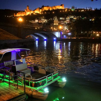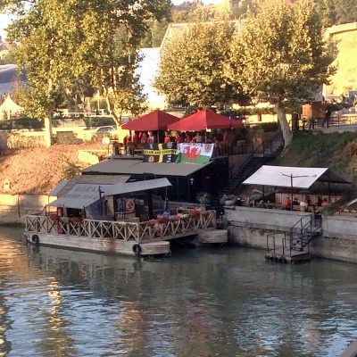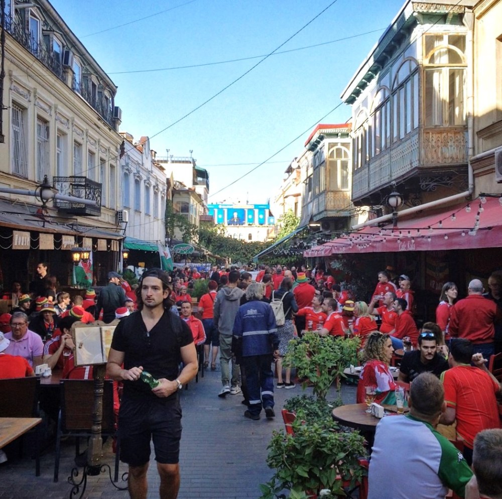 Natürlich hatte man hier eine fantastische Aussicht auf die Millionenstadt Tbilisi. Von oben erspähten wir neben unzähligen modernen und historischen Sehenswürdigkeiten eine Bar am Ufer der Kura, welche die Waliser ordentlich beflaggt hatten. Sah gemütlich aus und wir hatten unser Touri-Pensum erreicht, also nichts wie hin da! Auch hier herrschte gute Stimmung, wenngleich der erstbeste Waliser bereits mit dem Kopf auf dem Tisch schlief. Aber „Jeder kennt diesen einen Typen, der auswärts schon vor’m Spiel in der Kneipe einschläft.“ Oder? Wir kamen schnell mit ein paar älteren und munteren Casuals aus dem Norden des Landes ins Gespräch (aus der Ecke rund um Caernarfon) und verstanden uns auf Anhieb. Diverse Biere für 5 Lari (1,70 €) wurden in der Abenddämmerung gestürzt und als man erfuhr, dass wir noch ohne Tickets sind, wurde schnell zum Telefon gegriffen.