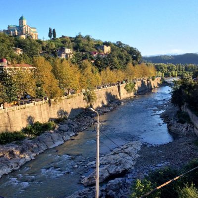Wenig später begann die Autobahn nach Tbilisi, welche parallel zum Fluss Kura verläuft. In nördlicher Ferne sind die Gipfel des zentralen Großen Kaukasus zu sehen (teilweise bis zu 5.000 Meter hohe Berge) und die Autobahn schien sogar komplett tierfrei zu sein. Stattdessen gab es hin und wieder menschliche Spaziergänger zu sehen, sowie einen orthodoxen Mönch als Anhalter auf dem Standstreifen. Nachdem Stalins Geburtsstadt Gori passiert war (das den weltweit bekanntesten Georgier aller Zeiten absolut unkritisch verherrlichende Stalin-Museum soll durchaus einen Besuch wert sein), wurde nochmal ein Stündchen bis zum Reiseziel gepennt.