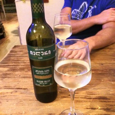 Als es gegen 19 Uhr dunkel wurde, stand ein Restaurantbesuch auf dem Programm. Dazu suchten wir in der bereits picobello sanierten Alexander-Pushkin-Straße das Palaty auf. Ein Restaurant mit junger Crew und Wohnzimmer-Wohlfühlatmosphäre (quasi der Hipster-Himmel von Kutaisi). Wir aßen vorweg eine äußerst delikate Käsesuppe mit gerösteten Brotwürfeln, als Hauptgang sehr würziges Rinderschaschlik mit Pilawreis und genossen dazu eine Flasche halbtrockenen Weißwein aus dem Alazani-Tal. Kostete pro Person alles zusammen umgerechnet schmale 10 €.
