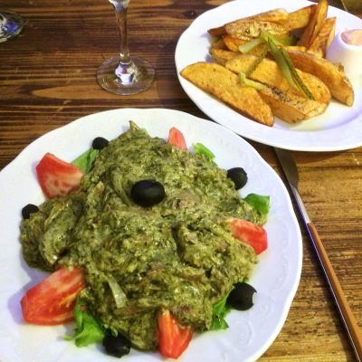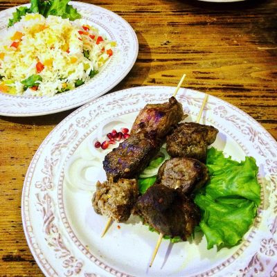 Hier waren alle Bars und Restaurants fest in der Hand der Waliser. In einem der Restaurants gönnten wir uns nun neben dem ersten Pint auch die Hauptmahlzeit des Tages. Es gab Schaschlik (außen kross, innen supersaftig) und Hackspieße (in Lavashbrot gerollt), sowie für jeden fünf Chinkali. Das wiederum sind georgische Teigtaschen mit Hackfleisch. Weil die Fleischfüllung in einer würzigen Brühe schwimmt, beißt man die Tasche auf, schlürft erst die Brühe und verzehrt dann den Rest. Dazu wurden übrigens noch geröstete Kartoffeln und Satsebeli (georgische Tomatensauce) serviert und wieder waren wir jeder nur ca. 10 € los.