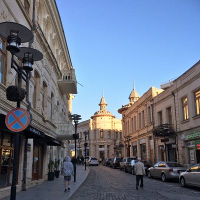 Nach dem großteils verschlafenen Flug, ging es mit einer Marschrutka (Sammeltaxi) für 5 Lari (ca. 1,70 €) pro Person ins rund 25 km entfernte Stadtzentrum. Wir erfreuten uns auf der Fahrt nicht nur an den waghalsigen Überholmanövern des Fahrers, sondern auch an Kühen (mit denen wir die Fahrbahn teilen dürften) und an verlassenen Gehöften am Straßenrand. Dazu natürlich das schöne Panorama schneebedeckter Kaukasusgipfel am Horizont.