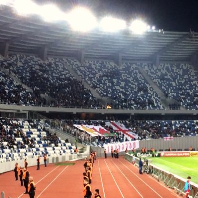 Da das Gros der über 2.000 Waliser bereits vor zwei Stunden mit den Shuttles angereist war, ging es kurz vor Anpfiff ohne Anstehen ins Stadion und hier erwartete einen außerhalb des Gästeblocks leider gähnende Leere (13.120 Zuschauer waren es insgesamt). Wales lockt sicher kaum einen georgischen Eventfan vor’m Ofen hervor und für die georgische Nationalelf ging es heute nur noch um die Ehre, während Wales noch auf ein WM-Ticket hofft. Jedoch dürften die Georgier bei dieser Ansetzung an einen ihrer größten Triumphe denken und die Waliser an eine ihrer derbsten Niederlagen. Wales heutiger Coach Chris Coleman war damals selbst als Spieler dabei, als die walisische Auswahl 1994 in Tbilisi mit 0:5 aus ihrer Sicht unterging.