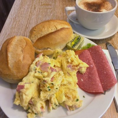 Nach völlig verschlafenem Flug, spazierten wir zu Fuß die 1,312 km vom Flughafen Dortmund zum Bahnhof Holzwickede und dort wurde der kalkulierte, aber nicht benötigte Sicherheitspuffer mit einem leckeren Frühstück bei der Bäckerei Grobe sinnvoll umgewidmet. Für 4 € gab es dort Rührei mit Schinken und zwei Brötchen mit Aufschnitt. 9:39 Uhr war Abfahrt und weil unser ICE nach Hannover on time war, konnte Ole nun sogar um 13 Uhr noch Fußball spielen (mit dem SC Itzum in Heisede), während mein SC Asel beiden Herrenmannschaften und den Gegnern einen freien Sonntag aufgrund von Unbespielbarkeit des Platzes spendierte. Aber als alter Knochen fand ich das heimische Sofa nach einem anstrengenden Trip sowieso viel cooler als alles andere.