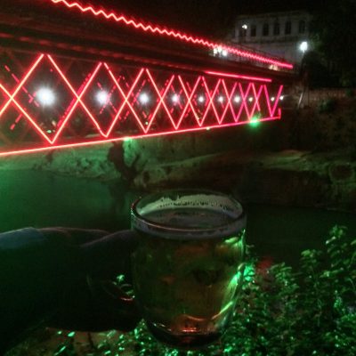 Mit immer noch zu viel Lari in den Taschen ging es heute abermals ins Restaurant Palaty. Es gab wieder eine Flasche Wein für uns, sowie Schaschlik und Pommes für Ole und Rindfleischstreifen in Estragonsauce und Kartoffelspalten für mich. Ob es nun am Estragon oder am Wein lag oder einfach daran endlich was im Magen zu haben, auf jeden Fall fühlte ich mich nach dem Essen viel besser als auf der Busfahrt. Entsprechend wurden im Anschluss auch noch ein paar Lari für Bier im El Galeon gelassen. Auf der Kneipenterasse am Ufer des Rioni ließ es sich ganz gut aushalten. Dennoch wirkte die ganze Stadt schon gegen 20 Uhr wie ausgestorben. Donnerstag habe ich mir nichts dabei gedacht, aber dass auch Samstagabend überhaupt nichts in Kutaisi los ist, hat mich schon gewundert.