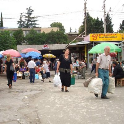 Mit kurzen Haaren und langen Schritten ging es nun auf die Suche nach Kutaisis Busbahnhof. Am altstädtischen Nippes-Markt quatschte uns ein Minibusfahrer an, nachdem wir gerade Imeruli Chatschapuri zum Frühstück gekauft hatten (rundes Weißbrot mit Käsefüllung). Wir verstanden kein Wort, sagten nur „Tbilisi?“ und er öffnete die Tür. Unser Instinkt sagte uns, dass er uns jetzt zum ZOB bringen würde und so geschah es auch. Am rund 4 km vom Stadtkern entfernten Busbahnhof wurden wir rausgeworfen und hatten einen Lari Transportgebühr zu entrichten. 35 Cent für vier Kilometer… zu Fuß gehen wäre teurer (man muss schließlich auch an die Abnutzung der edlen Sneaker bedenken)!