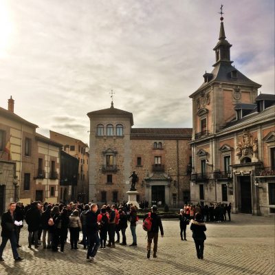 Von der Puerta del Sol ging es weiter zur Plaza Mayor. Dieser Platz von ungefähr 1.200 m² Größe kennt keinen motorisierten Verkehr und war zumindest an einem Samstagvormittag im Winter noch halbwegs unbelebt. Die geschlossene Renaissance-Bebauung weiß zu begeistern und optisch sticht dabei das Bäckerhaus (Casa de la Panaderia) mit seinen Fresken und Türmchen heraus. Felipe III de España (Philipp III.), spanischer König aus dem Hause der Habsburger, ließ den Platz von 1617 bis 1620 erbauen. Sein Reiterstandbild ziert die Mitte des Platzes. Früher fanden hier Stierkämpfe, Hinrichtungen und Reitturniere statt. Heute versuchen Gaukler täglich mit Kleinkunst den einen oder anderen Euro zu erwirtschaften, während die Stadt Madrid die prächtige Kulisse gerne für besondere Konzerte und Theateraufführungen nutzt.
