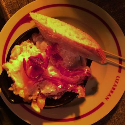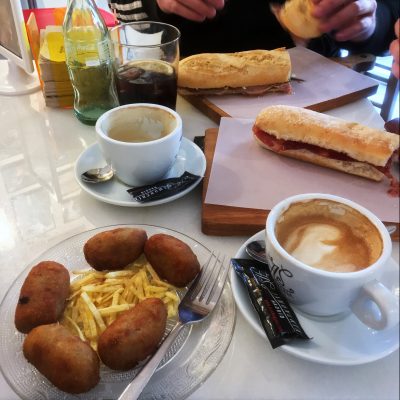 Nach dem Kick überlegten wir erneut ins Zentrum zu fahren, um dort ein paar Bars unsicher zu machen. Doch in der Metro kam uns in den Sinn, dass es jetzt ja auch nicht dumm wäre, schon zurück nach Barajas zu fahren und dort zu zechen. Jetzt so gegen 19 Uhr dürfte im Zentrum des 45.000-Einwohner-Stadtbezirks alles offen haben, inklusive der gestern von uns begehrten Bar Lizzaran. Dem war auch so und wir nahmen Platz im beheizten Vorzelt des Lokals. Neben abermals Weißwein, gab es diverse Runden Tapas, um sogleich auch das Thema Abendessen geschmackvoll abzuhaken. Weil wir nur um fleischige Tapas baten, gab es am Anfang Schinkenbaguette, gefolgt von Schinkenkroketten, dann Chorizo, danach eine Art Omelette mit Schinken und am Ende Schweinesteak mit Käse überbacken. Nebenbei hatten wir unseren Spaß mit der heiteren Kellnerin, die uns mit ihren paar deutschen Wörten begeisterte. Während wir immer versuchten auf Spanisch zu bestellen („Queremos otra botella de vino blanco, por favor“), antwortete sie mit „Ja, ja, natürlich“ oder „Ja, ja, sehr gerne“.