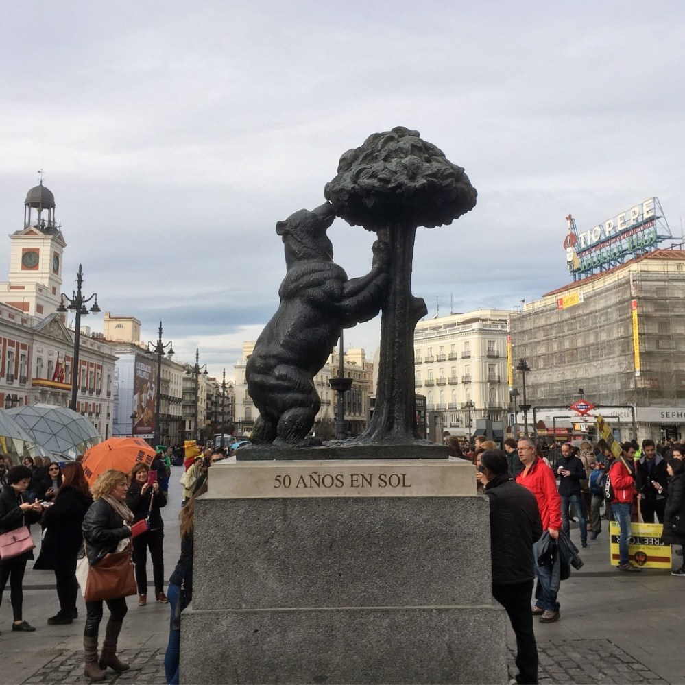 An der Puerta del Sol, wo früher ein Stadttor mit einem Sonnenemblem stand, treffen sich alle Hauptstraßen des Landes, bzw. haben hier ihren Kilometer Null. Der Platz ist also quasi der Mittelpunkt Spaniens und stand zumindest in der Neuzeit regelmäßig auch im historischen Mittelpunkt. 1808 tobte an dieser Stelle der Aufstand gegen Napoleon, 1912 wurde hier das Attentat auf den Ministerpräsidenten Mendez verübt und 1939 feierte Franco seine Machtergreifung an der Puerta del Sol. Der Platz ist entsprechend seiner zentralen Lage sehr belebt und neben Gauklern, sind auch etliche Gauner am Geld der Touristen interessiert. Außer den klassizistischen Gebäuden des halbrunden Areals, sind auch bronzener Bär und Erdbeerbaum vom Madrider Stadtwappen ein beliebtes Fotomotiv. Bär und Baum trägt auch Atlético de Madrid im Vereinswappen und deren Fans feiern passenderweise an diesem Platz ihre Titel. Titelfeiern kommen zwar nicht ganz so häufig vor wie bei Real, aber das macht die Sausen wahrscheinlich nicht schlechter.