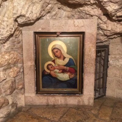 Außerdem war der nächste Programmpunkt wesentlich absurder. Wir gingen zur fußläufig von der Geburtskirche erreichbaren Milchgrotte. Die junge Familie aus Nazareth soll nach der Geburt nochmal in Bethlehem die Höhle gewechselt haben und hier hat Maria ihr Baby das erste Mal gestillt. Dabei sind Tropfen ihrer heiligen Milch auf den Boden geplätschert und die Felswände färbten sich kalkweiß. Nun kommen seit Jahrhunderten kinderlose Frauen in die Grotte und beten für eine baldige Befruchtung. Und wer nicht allein auf sein Gebete vertrauen will, kann auch noch den abgeschabten Kalk in Wasser aufgelöst trinken. Es soll wirklich Wunder wirken und weit über Tausend glückliche Mütter haben schon Dankesbriefe und Kinderfotos an die Franziskanermönche, welche die Grotte verwalten, geschickt. Lassen wir mal so stehen…
