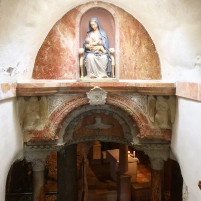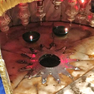 Die besagte Felsgrotte befindet sich nun unterhalb des Altarraumes und dorthin war wirklich eine unfassbar lange Schlange, mit vor allem wenig Bewegung, auszumachen. Das hätte bestimmt, wie prophezeit, ein bis zwei Stunden Wartezeit in Anspruch genommen. Doch der Guide machte sich bezahlt und führte uns tatsächlich an allen vorbei zum Eingang der Grotte. Dort unten konnten wir nun Weihrauch schnüffeln und den Stern von Bethlehem berühren. Der Stern markiert die mutmaßliche Stelle, wo Baby Jesus das erste Mal von Mama Maria und Stiefpapi Joseph in den Schlaf gesungen wurde. Eine ergriffene Frau brach in Tränen aus und konnte sich gar nicht mehr beruhigen. Meine Mitreisenden dagegen packten à la Dschungelprüfung in das Loch in der Mitte des Sterns und waren enttäuscht, dass da nur ein Hohlraum ohne Inhalt ist.