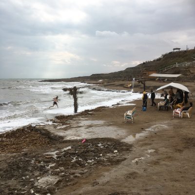 Am Eingang zeigte Ali stolz auf die Stelle mit 85 NIS auf der Preistafel. Ganz unten war allerdings die englische Übersetzung „Day Pass“ zu lesen. Für 30 bis 60 Minuten wird man wohl kaum 85 Shekel abkassieren und Ali hatte komischerweise auch nichts am Kassenhäuschen zu blechen, sondern wir wurden alle so durchgewunken. Bestimmt wird das alles per Paypal abgerechnet. Oder berühtungsloses Zahlen mit Kreditkarte. Modernes Land, dieses Palästina! Zum Glück habe ich die Gabe solche Aufreger vorerst auszublenden, um in Ruhe den Ort genießen zu können. Leider war Baden heute strikt verboten. Bei steifer Brise und niedrigen Temparaturen von 13° C wäre das auch kein Vergnügen geworden. Doch einmal die Füße in die berühmte Brühe reintunken, hätte es schon gerne sein dürfen. Nur rief der Bademeister jeden energisch zurück, der sich dem Wasser näherte. Wo ist nur Ali, wenn man ihn braucht? Für 20 Shekel wäre da bestimmt eine Sondergenehmigung drin gewesen. Unser Freund wartete allerdings am Ausgang und rief „Yalla, yalla“, als wir dort noch schnell das Wi-Fi für unsere treuen Instagram Follower auskosten wollten.