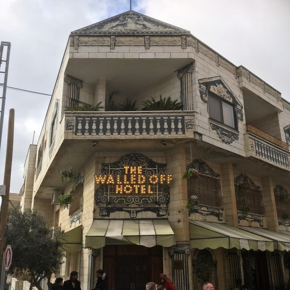 Das The Walled Off Hotel wirbt mit der schlechtesten Aussicht der Welt. Banksy hat es finanziert und gestaltet. Als es im März 2017 eröffnete, wurde weltweit berichtet. Wir schauten uns um und entdeckten darin überall seine subversive Kunst, gepaart mit klassischer britischer Eleganz. Anstatt aus einem Springbrunnen, sprudelte Wasser zum Beispiel aus einem zerschossenen Hauswassertank, wie wir sie gestern in Hebron auf den Dächern der Wohnhäuser gesehen hatten. Über dem Kamin waren Überwachungskameras als Jagdtrophäen inszeniert und Banksys Wandmalereien hingen als Gemälde gerahmt an den Wänden. Außerdem gab es ein kleine museale Ausstellung zur Konfliktgeschichte und eine Galerie, in der palästinensische Künstler ihre Werke ausstellen können (beides für jedermann zugänglich). In Summe machen Kunst und Luxus natürlich stolze Übernachtungspreise von 50 € (Hostelbett), über 170 € (einfachstes DZ) bis hin zu 770 € (Presidential Suite). Das Hotel soll gut ausgelastet sein, was ein finanzieller Segen für alle beteiligten Palästinenser sein dürfte.