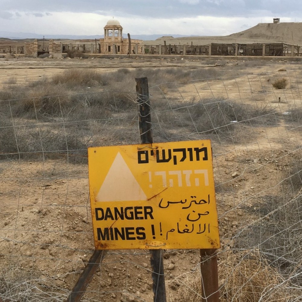 Die nächste Etappe unserer Rundreise führte uns zum Jordan. Der Fluss ist bekanntlich die Grenze zwischen dem haschemitischen Königreich Jordanien und dem, was vielleicht irgendwann mal der souveräne Staat Palästina wird (Westjordanland). Da Jordanien und Israel sich in diversen Kriegen gegenüberstanden und das Westjordanland von 1948 bis 1967 von Jordanien annektiert war, war auch hier keine entspannte Grenze zu erwarten (obwohl Jordanien mittlerweile eines der wenigen islamischen Länder ist, welches diplomatische Beziehungen zu Israel unterhält). Die Straße zum Fluss hatte jedenfalls einen vorgelagerten Checkpoint und rechts und links der Fahrbahn waren ausgedehnte Minenfelder zu bestaunen.