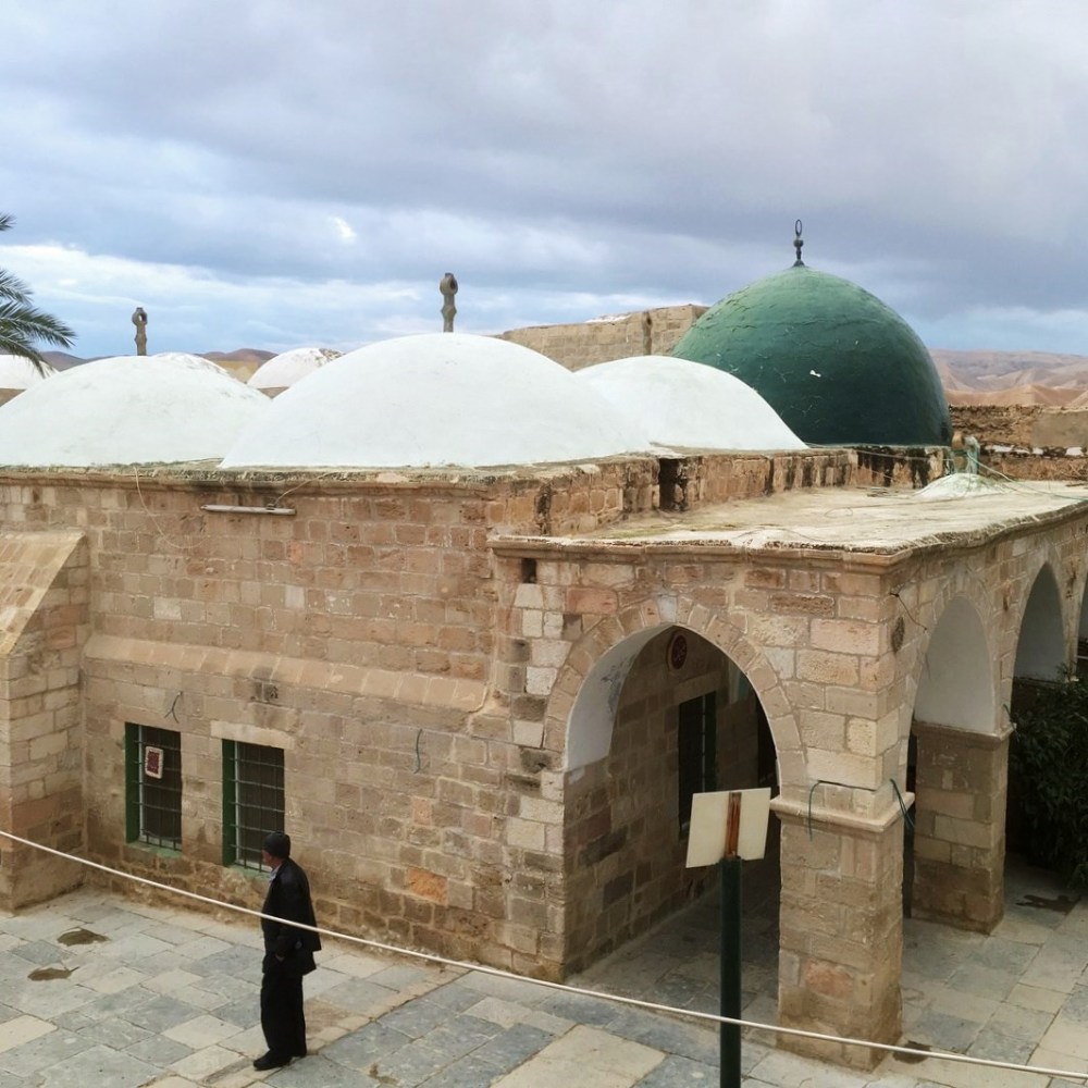 Nach 30 Minuten Lustwandeln war Lagebesprechung in der Gaststätte an der Ausgrabungsstätte. Das Felsenkloster St. Georg oder Qumram (Fundort der berühmten Schriftrollen von Qumram) wären jetzt noch interessante Destinationen gewesen. Aber laut Ali war es dafür schon zu spät. Wir müssten nochmal wiederkommen, wenn die Tage wieder länger sind. Dann habe auch alles länger geöffnet. Als Alternative hatte er die Moschee Nabi Musa im Angebot. Hier befindet laut islamischer Überlieferung das Grab von Moses (ja, der wird im Islam ebenfalls als Prophet verehrt). Gut, dann dahin…