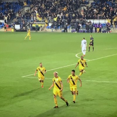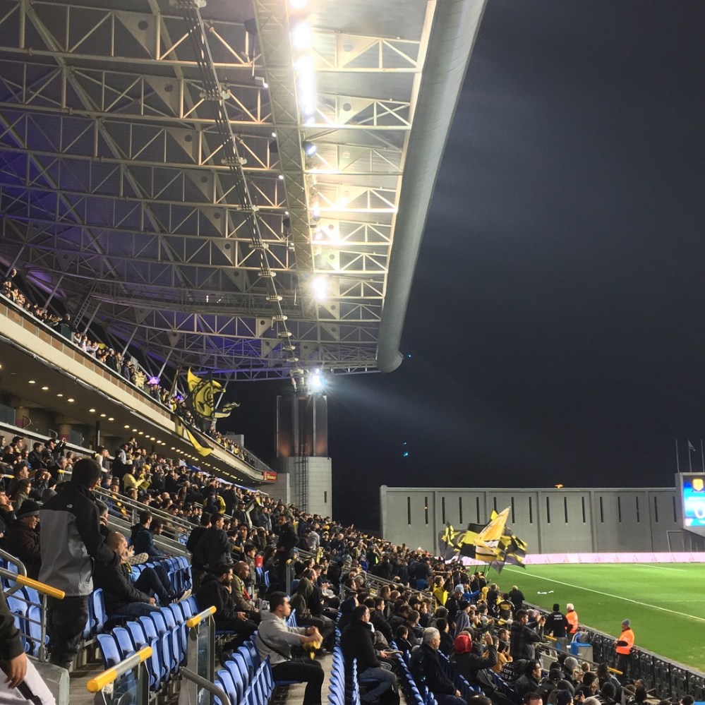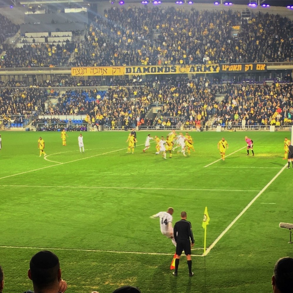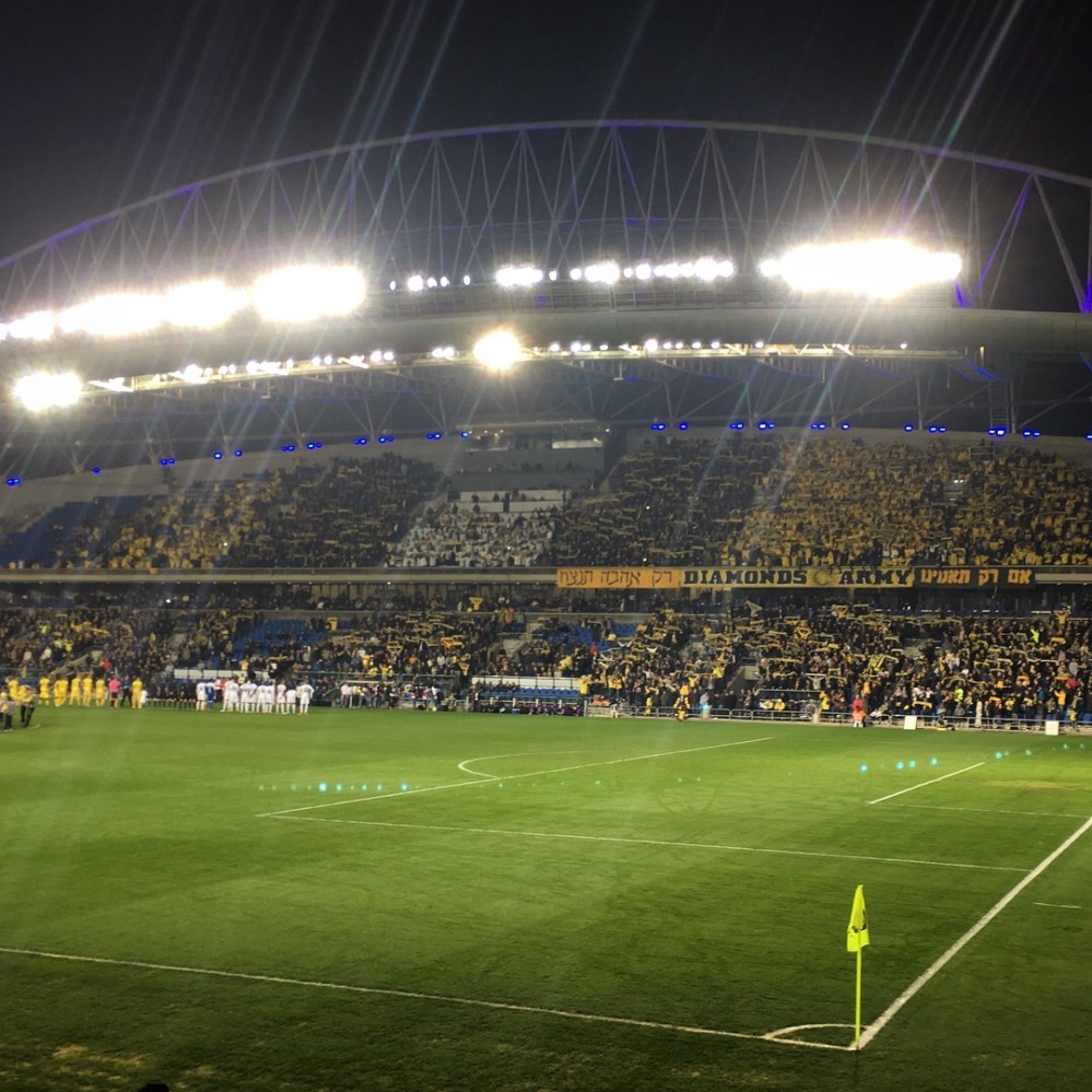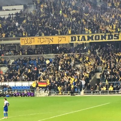 Für’s Fanherz wurde heute erfreulicherweise nicht nur ’ne Choreo geboten, sondern die Stimmung war allgemein auf hohem Niveau. Hätte ich nicht unbedingt erwartet, denn gerade bei Maccabi Netanya hatte ich keine so große und aktive Fanszene auf dem Schirm. Doch der Club mit dem Diamanten im Wappen hatte in den 70er und 80er Jahren des vorigen Jahrhunderts eine sehr dominante Phase im israelischen Fußball. Damals wurde wahrscheinlich der Grundstein für einen großen und treuen Anhang gelegt und in der jüngeren Vergangenheit war man 2007 und 2008 immerhin Vizemeister. Dann übernahm Lothar Matthäus und war in der Saison 2008/09 sogar lange auf Meisterschaftskurs. Am Ende reichte es doch nur zu Platz 4 und Matthäus musste gehen, offiziell aus finanziellen Gründen. Geldprobleme gab es in der Tat und nachdem man sich noch ein paar Jahre in den Top 6 halten konnte, stieg man zwischenzeitlich zweimal in die 2.Liga ab (2013 und 2016). Als frischer Aufsteiger ist man aktuell als Tabellensechster jedoch wieder ganz gut unterwegs.