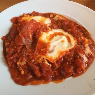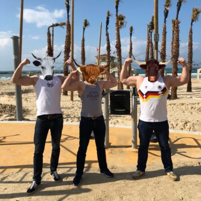 Danach schlief ich nochmal bis 12 Uhr und war dann überraschend fit und vor allem derbe hungrig. Mit Schirm, Abto und Ole ging es bei strahlendem Sonnenschein zum Frühsport an den Strand (keine Angst, ich habe nur die Poserfotos geknipst) und im Anschluss wieder zu Shakshukia zum Frühstücken. Heute gönnte ich mir die Tomaten-Eier-Spezialität Shakshuka mal mit geräucherter Gänsebrust. Auch lecker, aber die Merguez-Fleischeinlage bleibt mein Favorit.