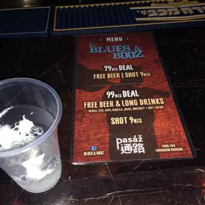 Shira verabschiedete sich nach unserem Kauferfolg zu ihren Leuten, wo zum Glück kein Platz mehr für weitere Typen in der Sitzecke war. Das waren nämlich alles nur Kerle, inklusive ihrem aktuellen Sexualpartner (Beziehung wollte sie es im Vorfeld nicht nennen, „It’s something else“). Schade, hatten wir doch auf eine Armada von Freundinnen gehofft, die alle ebefalls gerade den Wehrdienst beendet hatten und nun Bock auf eine internationale humanitäre Mission haben. Solch ein unverschämtes Glück war uns leider nicht vergönnt. Aber mit Bier ohne Limit kann man sich auch erstmal zufrieden geben, dachten sich Schirm, Abto, Ole und ich. Die bändchenlosen Gulle und Max hatten dagegen in wenigen Stunden die letzte Gelegenheit für einen Tagestrip nach Jerusalem auf dieser Reise (wo ich eigentlich als Guide fungieren sollte) und gingen deshalb schweren Herzens nach einem Drink ins Appartement. Der Rest genoss wirklich gute handgemachte Musik von diversen Bands (war alles relativ rockiger Blues), hatte nette Gespräche mit anderen Gästen und konsumierte etliche Biere. Am Fuße der Angebotskarte stand nicht ohne Grund „Good Luck Tomorrow Morning“. Doch lass das mal das Problem von Zukunfts-Schneppe sein, dachte ich mir. Stattdessen wurde bis Ultimo gefeiert (3:30 Uhr) und einen nächtlichen Snack in einer Pizzastube gab es auf dem Heimweg auch noch.