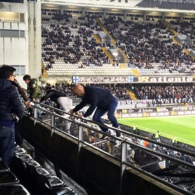 In der 2.Hälfte schien das Selbstvertrauen bei den Conquistadores aus Guimarães soweit zurückgewonnen, dass sie mehrere Angriffe wagten. Der Trainer tat mit einem offensiven Doppelwechsel in der 63.Minute sein Übriges für die Bemühungen um einen Heimsieg. Das Publikum goutierte dieses Treiben und unterstütze die Mannschaft nun von allen Rängen. Dabei erwies sich auch die Omi hinter uns als sehr textsicher. Der gefährlichste der insgesamt sechs Torschüsse von Vitória ging allerdings nur ans Lattenkreuz (der eingewechselte Rafael Martins in der 89.Minute), während sich ansonsten Gästetorwart André Moreira als unüberwindbar entpuppte.