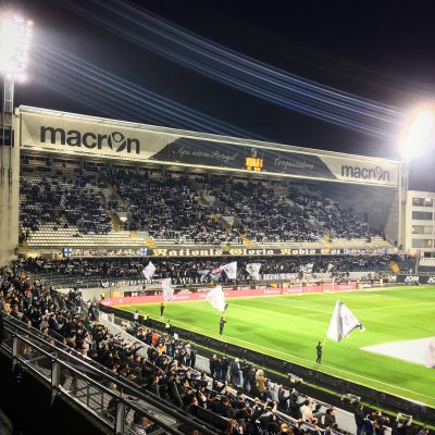 Die Gruppe White Angels und ihre zahlreichen Sektionen machten 90 Minuten lang auch wirklich gut Alarm. Vor allem hatten die ein paar Melodien, die mir bisher unbekannt waren. Die Szene war mir bereits von der umgekehrten Ansetzung Belenenses – Vitória SC im Januar 2016 positiv in Erinnerung geblieben und konnte diesen Eindruck heute noch verstärken. Die sangesfreudige Heimkurve war eines der drei Highlights dieses Spiels. Das zweite war das Stadion und das dritte war der Ausschank von Vollbier.