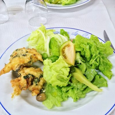 Das Restaurant war gut gefüllt und sogleich wurden leckere Fischkroketten (Pasteis de Bacalhau), ein Korb mit frischem Brot und eine große Schüssel gemischter Salat auf den Tisch gestellt. Alte gastronomische Portugal-Regel: Wenn man es anrührt, muss man es auch bezahlen. Ansonsten wird es unberechnet wieder abgeräumt Aber wir hatten eh Bock auf die servierten Vorspeisen und alles zusammen kostete auch nur ungefähr 3 € pro Person. Die Speisekarte bot dann eine große Auswahl lokaler Atlantikbewohner (alle Hauptgerichte so 10 bis 15 €), jedoch reichten Berger, Lo und mir vorerst die Fischkroketten in Sachen maritimer Nahrung. Ein Rindersteak frisch vom Grillrost für 11 €, das wär‘ ja auch was, dachten wir, während Ole sich einen Spieß mit Gambas und Tintenfisch kommen ließ.