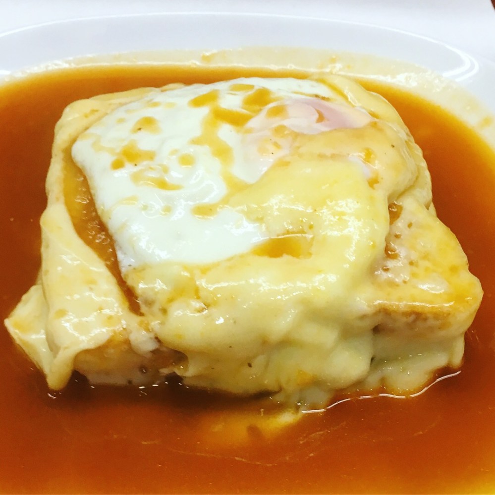 Weil ich schon gleich am Eingang diverse Teigwaren aus den Auslagen bestellt hatte, bekam die Toruristenkarte leider erst am Tisch zu Gesicht. Deshalb wusste ich auch nicht, dass es hier Francesinha gab. Als meine Freunde dann richtig geile Kalorienbomben für 8,50 € das Stück serviert bekamen, war ich etwas neidisch. Doch ich sagte nur: „Not yet Kameraden! Not yet!“ und dachte an die zwei weiteren Urlaubstage, die genug Zeit ließen, um selbst noch in den Genuss dieser Krone der Francesinha-Schöpfung zu kommen. Außerdem stibitzte ich schon mal fleißig von den als Beilage servierten und mit Rosmarinsalz gewürzten Fritten. Die Bedienung war sogar so zuvorkommend, mir eine Extra-Gabel für die Diebestouren auf fremde Teller zu bringen. Obrigado!