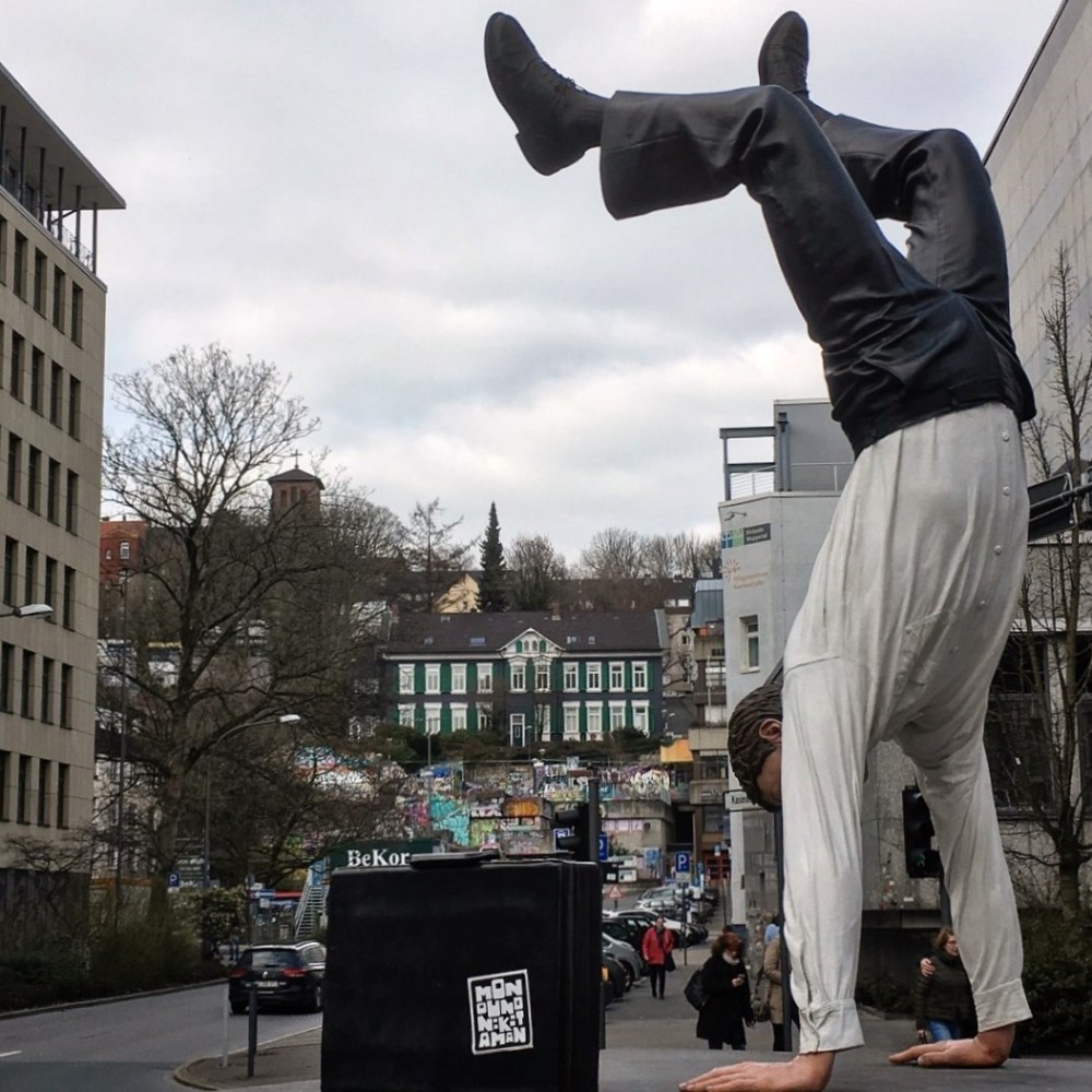 Doch Olbert musste sich keine Sorgen machen und wurde ab 7:37 Uhr in der Nordwestbahn nach Löhne von uns dabei unterstützt seinen Reiseproviant, eine Palette pfandfreies belgisches Dosenbier, kontinuierlich zu verkleinern. Der Umstieg in Löhne wurde schließlich für Frühstückserwerb bei einem Discounter genutzt. Brötchen mit italienischem Landschinken und spanischem Jamón serrano waren das Einkaufsergebnis. Es gab noch einen weiteren Umstieg in Dortmund und pünktlich um 11:56 Uhr wurde der Wuppertaler Hauptbahnhof erreicht. Olberts Palette war ebenfalls just in time leer und folglich hielt er mal so gar nichts von meinem nicht ganz ernst gemeinten Plan das Wuppertaler Bibelmuseum zu besuchen und dort die Zeit bis zum Anpfiff zu verbringen. Aber bei mir weiß man wohl nie, daher gab es erneut einen tödlichen Blick.