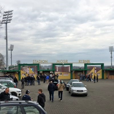 Nach 30 weiteren Minuten des Flanierens, war es daher auch nicht schlimm, dass nun das erste von drei Fußballspielen am heutigen Tag rief. ROW 1964 Rybnik empfing Siarka Tarnobrzeg zum Drittligaduell. Sicher das Spiel heute, welches man noch am ehesten hätte streichen können. Aber das Stadion hatte Charme (abgerockt, speedwaytauglich und mit über 10.000 Plätzen) und mit zwei kleinen Fanszenen war auch zu rechnen. Zumal heuer noch zwei große Verbündete der Rybniker ihre Spiele hatten (Górnik Zabrze um 15:30 Uhr und GKS Katowice um 20:15 Uhr) und absehbar war, dass die Gladiators das eigene Spiel um 12 Uhr mittags als Sammelpunkt und Warm up nutzen wollen.
