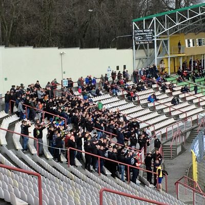 Zur 2.Halbzeit enterten sie dann einen Zuschauerblock neben dem harten Kern von ROW, beflaggten diesen und begannen zu supporten. Das animierte die bisher auch nur lose in ihrem Block rumstehenden Rybniker ebenfalls zum Support. Sie formierten sich mit etwa 100 Mann und ein Capo gab die Gesänge vor. Interaktion mit den Gästefans jedoch weiterhin Fehlanzeige. Vielleicht gibt es im komplizierten polnischen Atlas der Freundschaften und Bündnisse einen gemeinsamen Freund, der zum Waffenstillstand anregte? Oder man hat einfach ein neutrales Verhältnis mangels gemeinsamer Konflikthistorie? Eine nachträgliche Recherche ergab schließlich, dass beide Szenen Kontakte zu Wisłoka Dębica pflegen und sich deshalb respektieren.