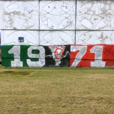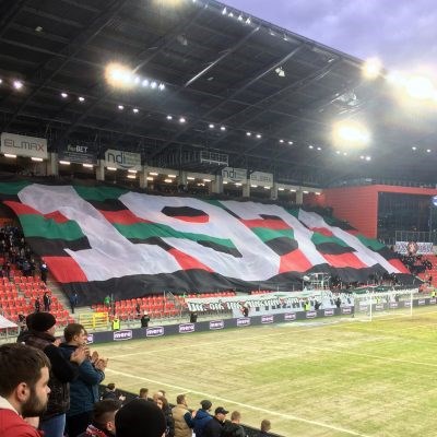 Zur zweiten Hälfte war die Choreo abgehangen und dafür alle Zaunfahnen aufgehangen. Sichtbaren Besuch gab es von den Gladiators aus Rybnik und Swirlandia aus Jarosław, sowie aus der Tschechischen Republik. Die Generation 2016 und die Cosa Nostra von FK Banik Ostrava waren zu Gast (warum letztere sich nicht Cosa Nostrava genannt haben, werde ich als Fan schlechter Wortspiele wohl nie nachvollziehen können). Górnik Zabrze war zumindest mittels GKS-Górnik-Kameradschaftsfahne präsent, aber physisch werden bestimmt auch ein paar Fanatiker aus Zabrze einen Doppler am heutigen Sonnabend realisiert haben.