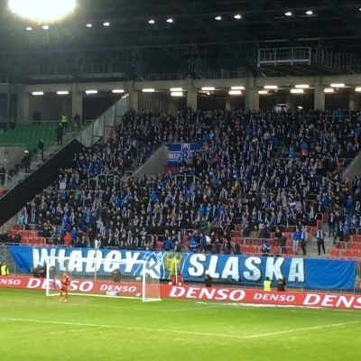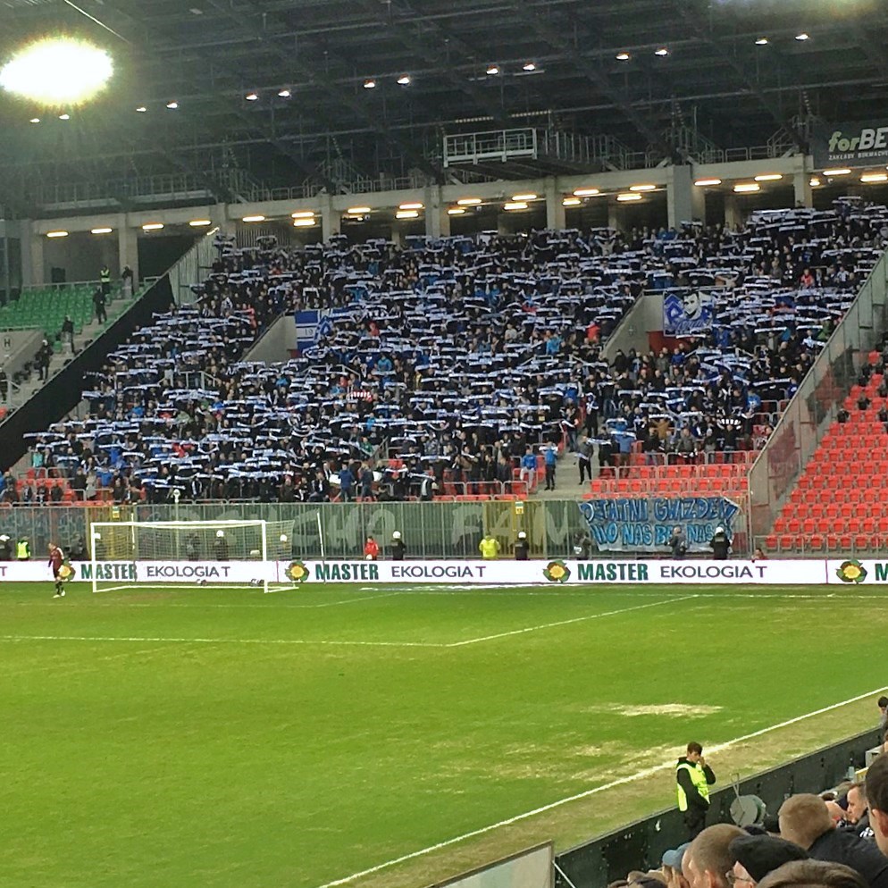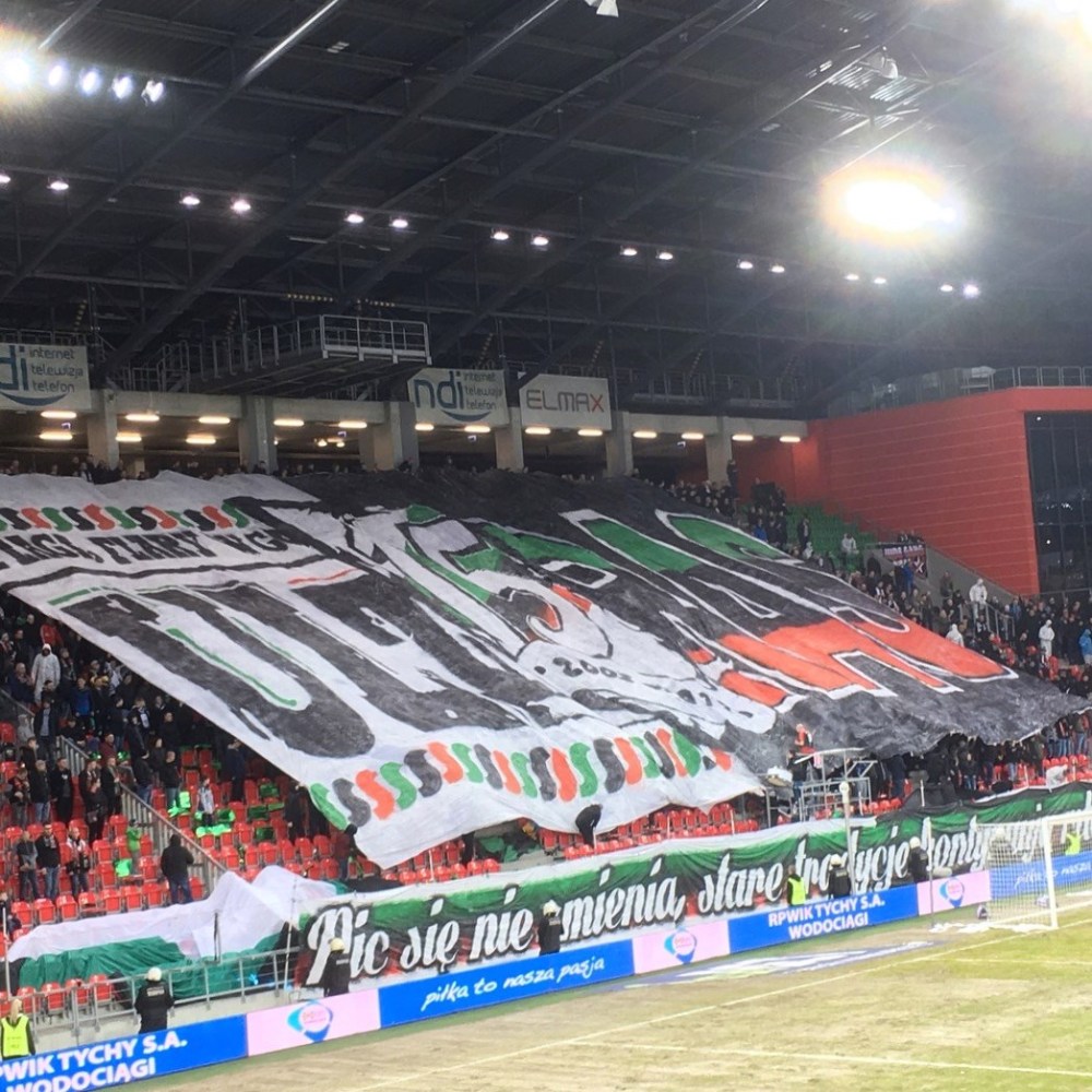Zunächst hüllten die Fans ihren Sektor in eine Blockfahne mit den Vereinsfarben und dem Gründungsjahr (1971). Dazu vor dem Block ein Banner auf dem frei übersetzt geschrieben stand: „Nichts ändert sich. Alte Traditionen werden von jungen Generationen fortgesetzt.“ Die Gästefans befestigten derweil vor ihrem Block ein großes Banner mit der Aufschrift „Władcy Śląska” (Herrscher Schlesiens, was auch auf ihren einheitlichen Fanschals stand).