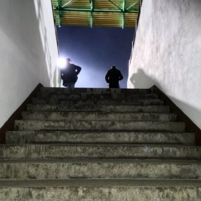 Im Sinne einer möglichst vollumfassenden Berichterstattung haben der Abt und ich die Spielunterbrechung genutzt, um uns das Ganze mal aus der Nähe anzuschauen. Gerade auch, was hinter den Rängen im Umlauf so los war. Tychy war weiterhin dabei sich Scharmützel mit der Polizei zu liefern und zurückgewichen wurde höchstens, um sich mit neuen Wurfgegenständen wie Trenngittern oder Mülltonnen zu versorgen. Das war wirklich ’ne wilde Schlacht.