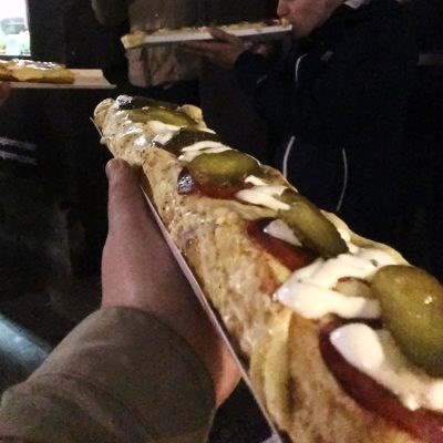 Wir orderten Zapiekanki (Polens Antwort auf Pizzabaguettes) beim Imbiss Z ogórem czy bez und nahmen jeder ein Zapiekanka mit Salami, Käse, Zwiebeln, Gurken, scharfen Pepperonis und Knoblauchsauce. Da wir anstatt normalen Ketchup unbedingt irgend so einen Scoville-Kracher haben wollten („You really want this? It’s very spicy“), brannte der Snack sich einmal von Norden bis nach Süden durch den Körper.