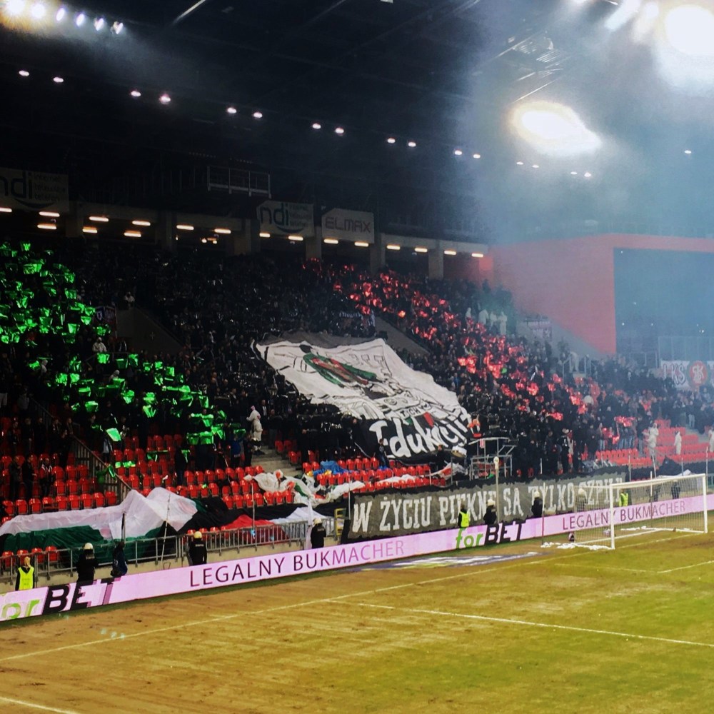 Das schwache Spiel des Elften (Tychy) gegen den Achtzehnten und somit Tabellenletzten ging mit 1:0 in die Pause und wir besorgten uns erstmal Bier. Dann hieß es zurücklehnen und die Show genießen. Denn mitnichten hatte die Heimszene schon zu Spielbeginn optische Akzente gesetzt, sondern man wollte offenbar warten bis das Stadion auch vernünftig gefüllt ist. Deshalb nun Vorhang auf für „45 Minuten Hardcore – Echte Gefühle“:
