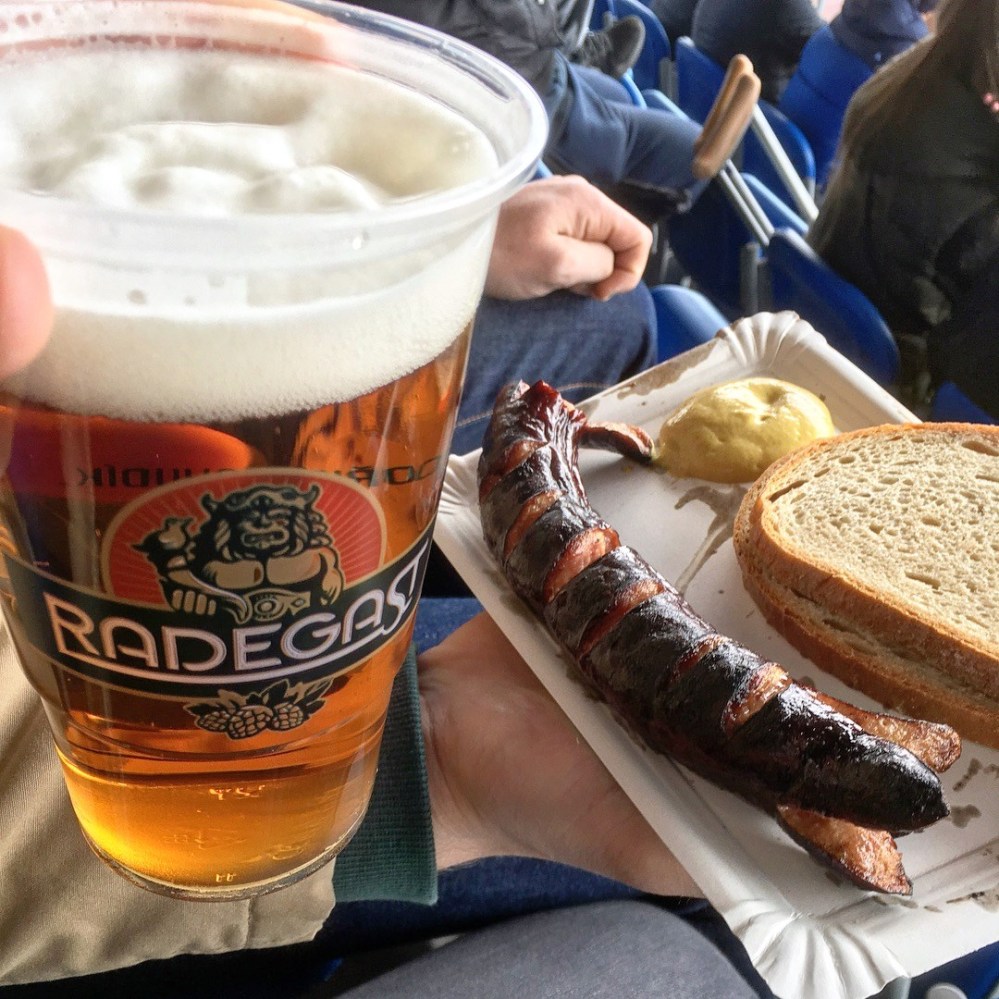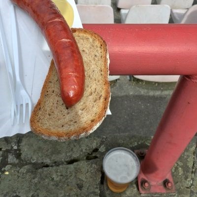 Um 14:40 Uhr stand das vom Kellner gerufene Taxi parat und binnen 10 Minuten waren die sechs bis sieben Kilometer zum Městský stadion – Vítkovice Aréna gemeistert. Taxi 1 € pro Person und Eintritt 2,50 € waren die Zusatzkosten für den kommenden Gammelkick. Gedankenspiele, dass Weiterzapfen bei The Pub eigentlich geiler gewesen wäre, verwarf die hiesige Stadiongastronomie. Es gab den Halben Radegast für knapp 1 € und ungefähr das Doppelte war für eine Klobasa zu zahlen, die allein die Anreise wert war. Fies fettig wie immer, aber dazu noch extrem knoblauchlastig im Geschmack.