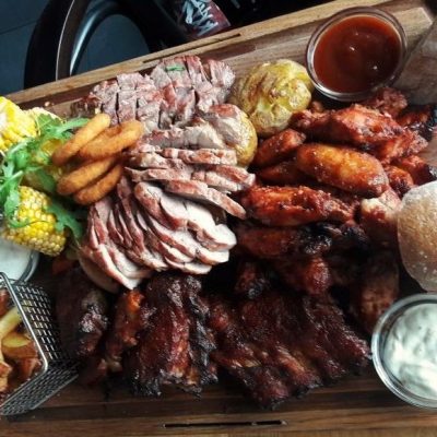 Ach ja, gegessen wurde natürlich auch. Ich hatte Schweinefilet mit Pilzsauce und Reis (ca. 8,50 €) und meine drei Freunde nahmen die Fleischplatte für 4 Personen (mit u. a. Spießbraten, Rippchen und Chicken Wings für umgerechnet 40 €). Sogar der Koch hat das Essen noch vor dem Servieren fotografiert. Er war also offenbar stolz auf sein Werk. Mein Essen war natürlich ein Pausenbrot gegenüber der Platte der anderen, aber zu viert wiederum wären bestimmt nicht alle von der Platte satt geworden.