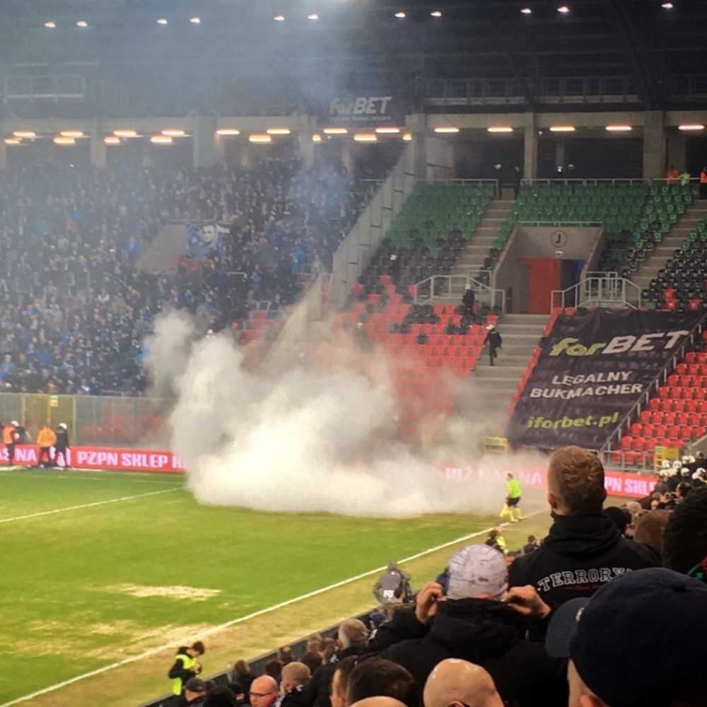 Die GKS-Hools wiederum deckten den Gästeblock mit Sitzschalen ein. Wer allerdings zu nah an die Gäste rankam, wurde gnadenlos von den Vertretern des staatlichen Gewaltmonopols niedergeknüppelt. Ein Tychyer, der über den Platz dem Gästeblock entgegen stürmte, bekam das besonders zu spüren. Als die Luft das Reizgas selbst zu unseren Plätzen auf Höhe der Mittellinie trug, war klar, dass die Spieler auch Atemnot haben dürften. Das Spiel wurde in der 69.Minute wenig überraschend für rund 10 Minuten unterbrochen, doch auf den Rängen und dahinter ging es munter weiter.