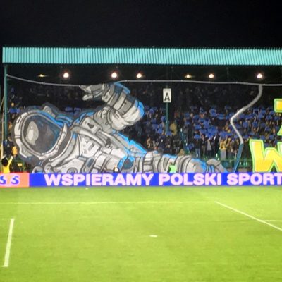 Nachdem die Stroboskopfackeln erloschen und Choreomaterialen wieder verschwunden waren, wurden als Schlusspunkt nochmal ungefähr 30 weiße bengalische Fackeln im Block gezündet. Wahrlich eine große Show und man verlor den Gästeblock zwischendurch ganz aus dem Augenmerk. Dort wurden nämlich unterdessen Fanutensilien der Heimszene präsentiert. Allen voran eine große Fanfahne. Zwar von den Fans der übrigens äußerst erfolreichen Eishockeysparte des GKS Tychy. Doch selbst wenn es da keine personelle Kongruenz mit den Fußballleuten geben würde, prickt das Sehen der eigenen Farben in Feindeshand natürlich wie ein „szpile“.