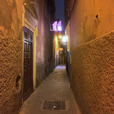 Gegen 23 Uhr hatten wir vom ins immaterielle UNESCO Welterbe aufgenommenen Platz vorerst genug gesehen. Also marschierten wir fehlerfrei zurück zum Riad und stoppten kurz zuvor nochmal beim Kiosk um die Ecke. Es wurde fast der gleiche Einkauf wie zuvor (nur eine Flasche weniger), wir fragten jedoch nicht nach dem Preis, legten einfach 20 Dirham hin und bekamen sogar noch zwei Dirham Wechselgeld wieder. Kaum steigst du nicht gerade mit Gepäck aus dem Taxi, bist du gleich weniger gefährdet über den Tisch gezogen zu werden. Es gab noch einen ginhaltigen Absacker auf der Dachterrasse und dann wurde in unseren Betten sanft geschlafen. Ich hatte sogar ein Schlafzimmer mit Doppelbett für mich allein. Luxus pur!