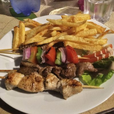 Irgendwann sah das Restaurant Le Bougainvillier ganz einladend aus. Man speiste in einem schönen blumigen Innenhof (Atrium) mit Brunnen. Leider war das Essen relativ geschmacksneutral (aber Gewürze sind in Marrakesch natürlich auch sehr schwer zu bekommen *rolleyes*), die Portionen waren klein und die Preise dafür hoch (z. B. 8 € für vier kleine Spieße und ein paar Fritten). Klassischer Touri-Nepp, aber der Hunger hat es reingetrieben. Wenigstens stellten wir wieder mal fest, dass die Welt nur ein großes Dorf ist und wir uns alle über zwei bis drei Ecken kennen. Ein türkischer Tourist von einem anderen Tisch sprach uns an: „Ey, seid ihr Fußballleute?“ (wie man das nur immer erkennt?). Er war regelmäßiger Stadionbesucher bei Galatasaray und durch einen gemeinsamen Bekannten bei UltrasLan waren wir sofort down miteinander.