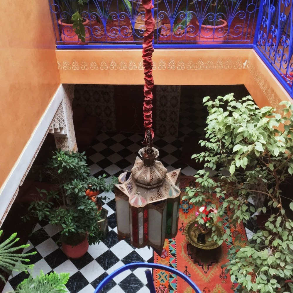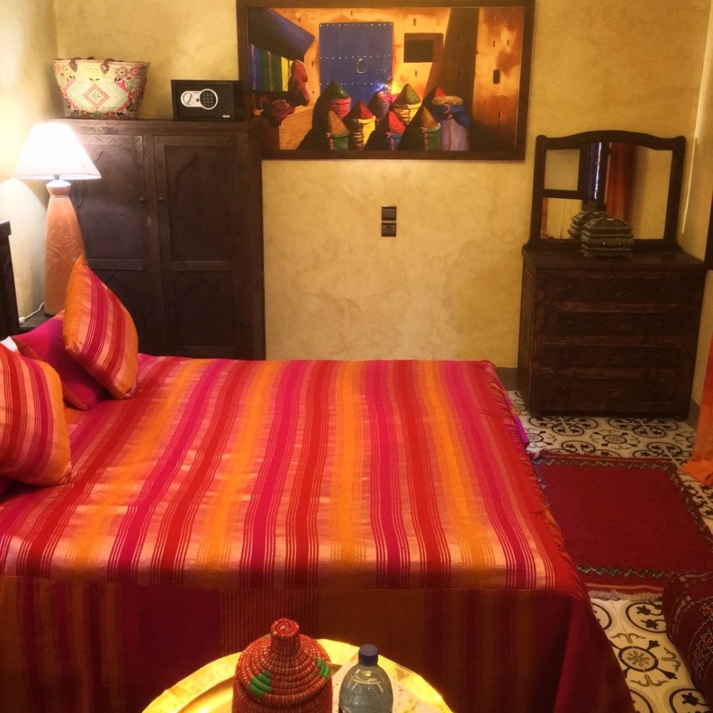 Unser Riad kannte der Fahrer zwar nicht, jedoch die „Hauptstraße“ (also die Altstadtgasse, die gerade noch so mit dem Auto befahrbar war), von der der mutmaßliche Hotelstandort abzweigen sollte. Wir ließen uns an einem Kiosk rauswerfen und kauften erstmal Cola und Tonic Water (vier Flaschen für zusammen 40 Dirham, also rund 3,60 €) und sahen, dass genau neben dem Kiosk die Gasse zum Riad Konouz abzweigte. Ideal. So wurden die ganzen Kids, die uns da hinbringen wollten, gekonnt ignoriert (wie es auch der Hotelier empfohlen hatte) und wir waren binnen weniger Minuten in eine Oase der Ruhe eingecheckt. Supernette Betreiberfamilie und superschönes Riad (Riads sind traditionelle, teilweise schon palastähnliche Wohnhäuser mit einem Atrium und werden heuer in Marrakesch zuhauf als Hotel genutzt).