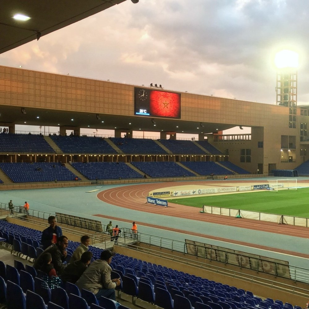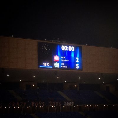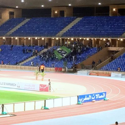Hatte uns dieses Internet also angelogen. Na ja, besser so, als eine Stunde früher Anstoß oder gar ein anderes Datum. So verquatschten wir noch eine Stunde und lauschten dem Musikprogramm, bei dem eine Mischung aus westlicher und einheimischer Popmusik aus den Lautsprechern dröhnte. Das moderne Stadion, einem internationalen Publikum bekannt durch den FIFA Club World Cup (2013, 2014) und die CAF African Nations Championship (2018), füllte sich derweil auch etwas. Offizielle Quellen gaben später 2.500 Zuschauer an, doch vielleicht waren auch nur 1.896 der 45.000 Plätze besetzt. Aber egal, es gab eine sehr lautstarke Heimkurve rund um die Ultras Crazy Boys 2006 (akustisch leicht argentinisch inspririert) und ebenfalls sangesfreudige Gästefans aus der Küstenstadt El Jadida (ca. 250 Menschen).
