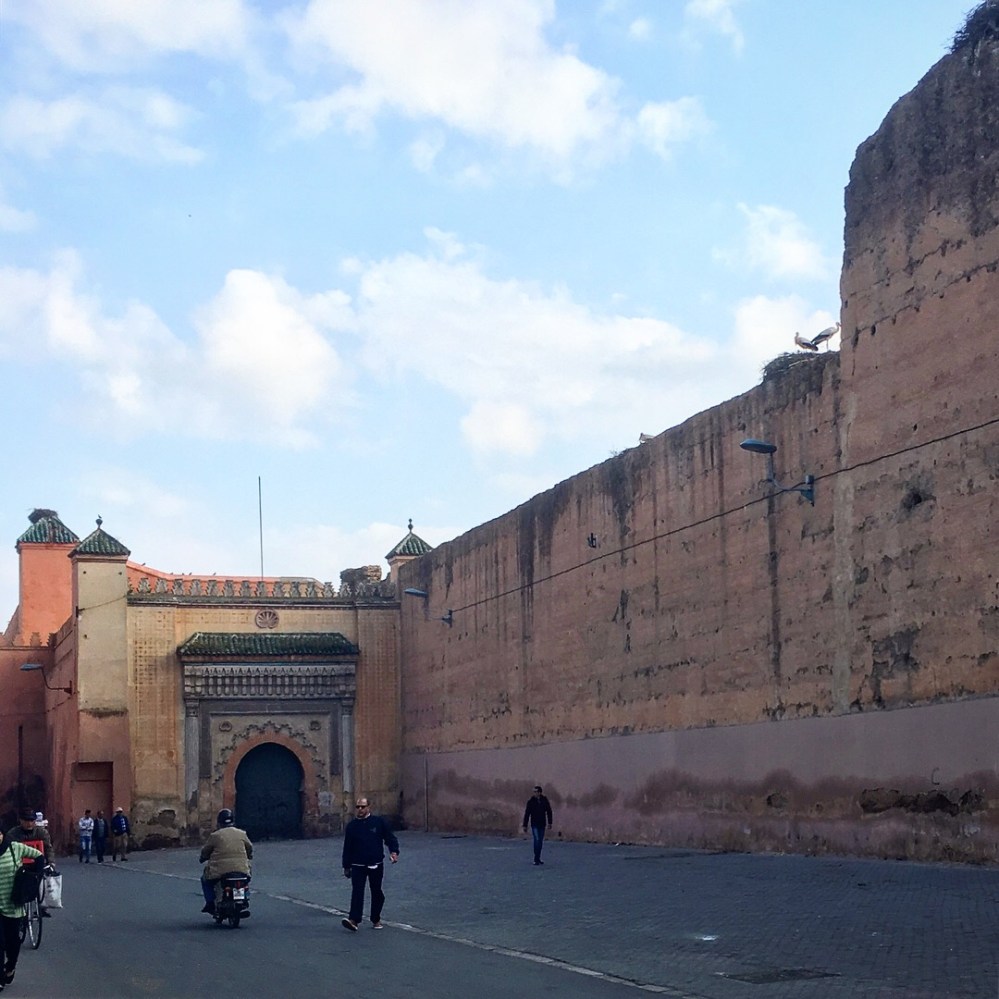 Der Königspalast von Marrakesch, also die Residenz, wenn der amtierende König von Marokko in der Stadt ist, ist dagegen nicht öffentlich zugänglich. Selbst Fotos, zumindest von den Eingängen, waren nicht erwünscht. Lediglich sonntags, ergo leider nicht heute, sind die laut Kartenmaterial riesigen Gärten des Palastes (Jardins de l’Agdal) frei bzw. teilweise zugänglich. Nichtsdestotrotz war die Gegend rund um den verschlossenen Palast und die ebenso nicht betretbaren Agdal-Gärten schön für einen Abendspaziergang. Alles wirkte recht gepflegt, Touris gab es wenige und angelabert von Geschäftemachern wurde man auch nicht.
